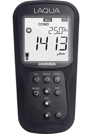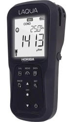 The Horiba LAQUA EC210 is a waterproof standard handheld meters with backlit LCD, shockproof & scratch-resistant non-slip casing, built-in electrode stand, and foldable meter stand in durable carrying case for routine water quality testing in the field.