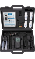 Waterproof standard handheld meters with backlit LCD, shockproof & scratch-resistant non-slip casing, built-in electrode stand, and foldable meter stand in durable carrying case for routine water quality testing in the field.