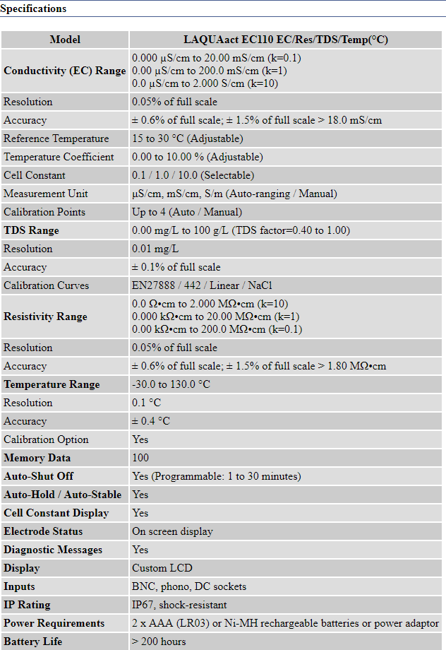 ModelLAQUAact EC110EC / Res / TDS / Temp (°C)