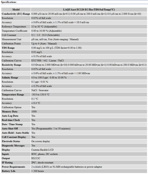 | Model | LAQUAact EC120 EC/Res/TDS/Sal/Temp(°C) |