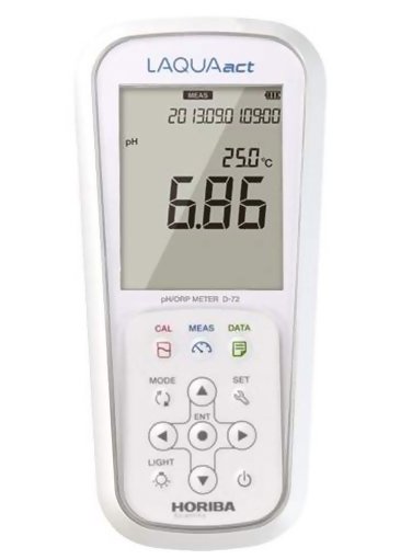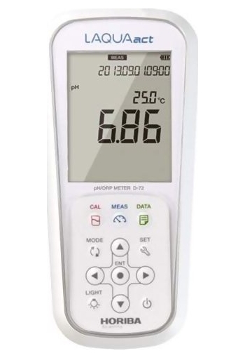 MODEL | D-72 | pH | Measuring principle | Glass electrode method | Measuring range | pH 0.00 ? 14.00 | Display range | -2.00 ? 16.00 ?Flashing in the case of outside measurement range. | Resolution | 0.01 pH | Repeatability | ±0.01 pH±1digit | Auto calibration (5 points) | ? | Calibration record | ? | Standard solution Auto-detect | ? | USA/NIST selectable | ? | Calibration interval alarm | ? | mV(ORP) | Measuring range (Display range) | -2000 ? 2000 mV ?Flashing in the case of outside measurement range. | Resolution | 1 mV | Repeatability | ±1 mV±1digit | Absolute. relative selectable | ? | Temperature | Measuring range (Display) | 0.0? ? 100.0??-30? ? 130??? ?Flashing in the case of outside measurement range. | Resolution | 0.1? | Repeatability | ±0.1?±1digit | Calibration function | ? | Display | Custom LCD with backlight | Function | PC connectivity*1 | ? | Printer connectivity?GLP / GMP? | ? | Temperature?compensation?Auto / manual) | ? | Auto Hold function | ? | Data memory number | 1000 | Interval memory | ? | ID input | ? | Clock function | ? | Auto power off | ? | Battery Level Indicator | ? | Dustproof and waterproof standard | IP67 | Operating ambient temperature / humidity | 0? to 45? , 80% or less in relative humidity (no condensation) | Power | LR03/AAA alkaline batteries or AAA Ni-H rechargeable batteries × 2 AC adapter 100 V to 240 V 50/60 Hz (option) | Current consumption | Less than 1 mA | Battery life*2 | Approx. 1000 hours | Dimension | Approx. 67 (80) × 28 (42) × 170 mm (The figures in parentheses are maximum thicknesses.) | Weight (without batteries and electrode) | Approx. 270 g | *1 RS-232C cable(3014030151) and software is required. Software can be download by web registration. If you need to connect to the USB, the adapter(RS232C? USB) commercially available is required. Please buy one that be suitable for the specifications of the PC (OS · USB Specification, etc.). ? HORIBA will not guarantee the adapter operation. *2 Battery life will be shorter when using optional accessories and backlight LCD is activated.
