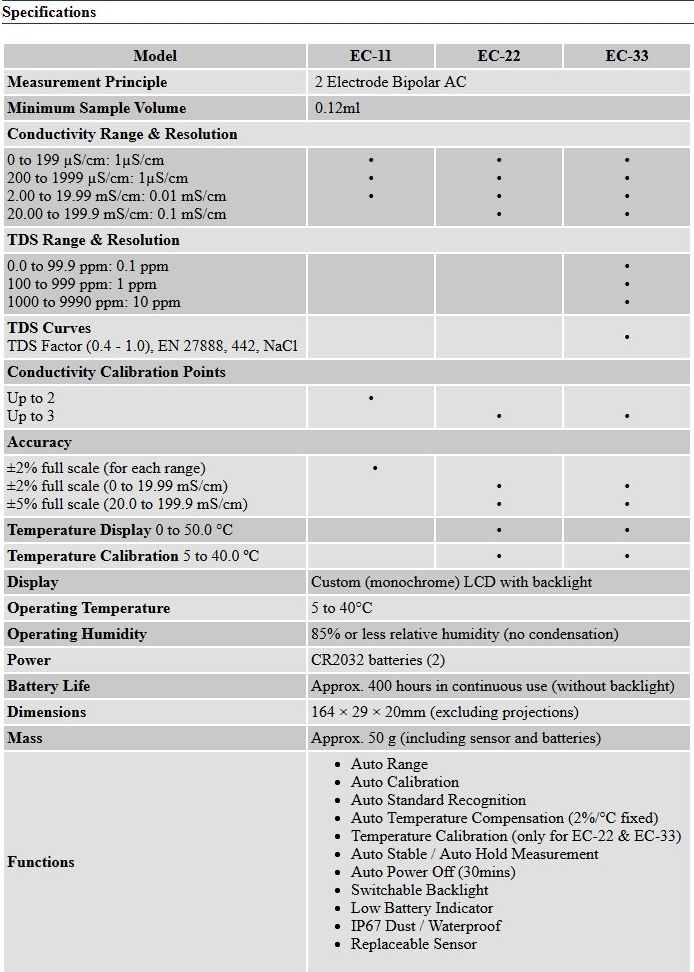 • Supplied with 1413µS/cm & 12.88mS/cm conductivity standards (14ml each), conditioning solution (4ml), 2 x CR2032 batteries, dropper, instruction and quick manuals