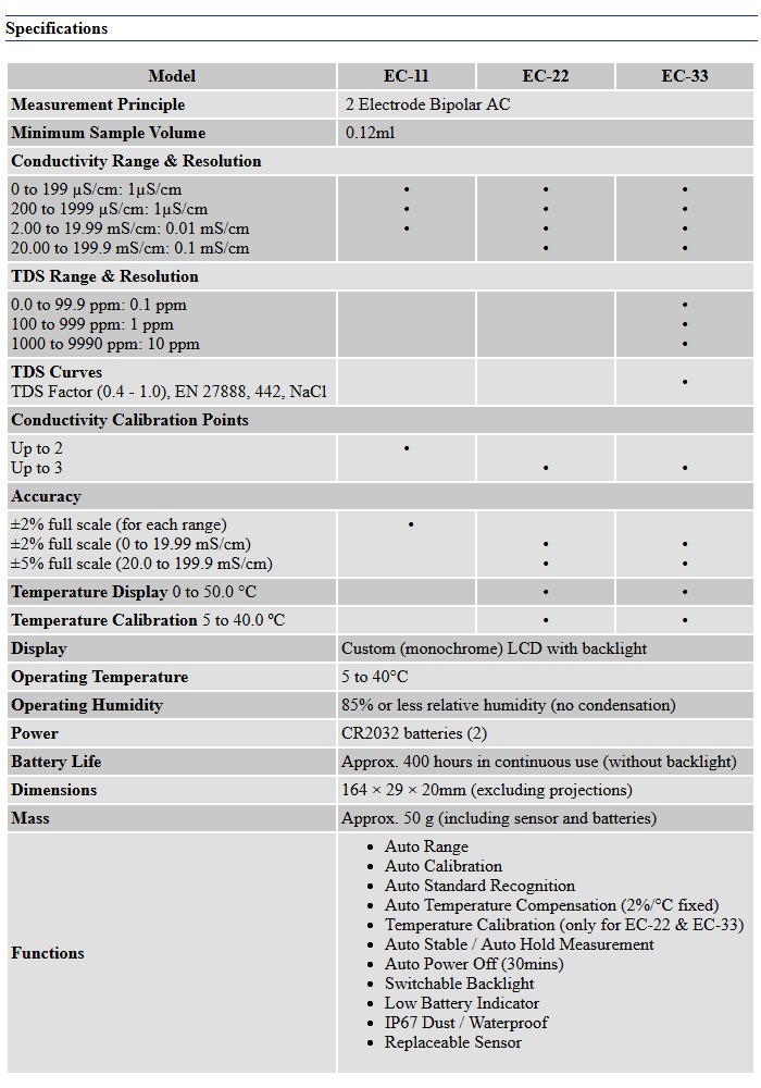 - Supplied with 1413µS/cm & 12.88mS/cm conductivity standards (14ml each), conditioning solution (4ml), 2 x CR2032 batteries, dropper, instruction and quick manuals
