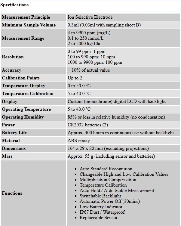 | Measurement Range | 4 to 9900 ppm (mg/L) 0.1 to 250 mmol/L 2 to 5000 kg/10a |