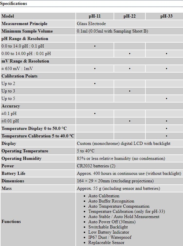 - Supplied with pH 4.01 & 7.00 buffers (14ml each), 5 x sampling sheets B, 2 x CR2032 batteries, dropper, instruction and quick manuals
