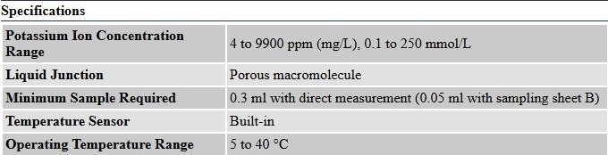 Potassium Ion Concentration Range4 to 9900 ppm (mg/L), 0.1 to 250 mmol/L