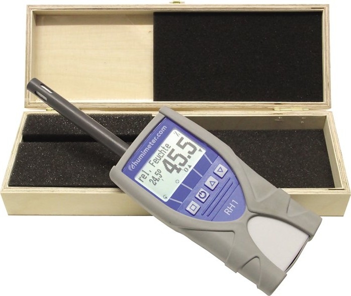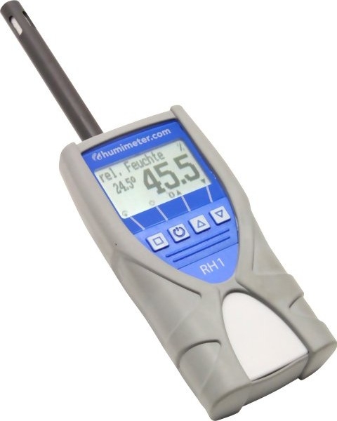 Precision hygrometer with datalogger The Humimeter RH1 Digital Relative Humidity Meter measures climate humidity easily, fast and accurately with the RH1 relative moisture meter, optionally available with a PC-interface, software and printer. How does it work? Relative humidity is the amount of water vapor that exists in a gaseous mixture of air and water and is normally expressed as a percentage. The relative humidity of an air-water vapor mixture can be estimated if both the measurement temperature and the dew point temperature of the mixture are known. This approach to measuring humidity requires an equation expressing the saturation vapor pressure as a function of temperature, the result of this equation is displayed by the RH1 hygrometer automatically as a relative humidity percentage. The RH1 hygrometer is the perfect instrument to aid humidity control and quality assurance!