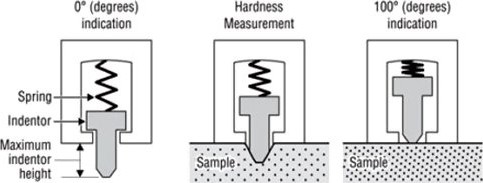 As the durometer is pressed against the sample, the material resistance force and indentor spring load balance. The depth of the indentor is measured, which provides a measure of the material’s hardness. Values are based upon a 100 point scale (accuracy ±1 point).