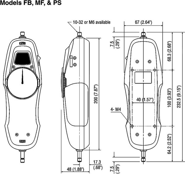 The resolution of the MF is 2 times finer than the FB mechanical force gauge. The ergonomic design is well suited for hand held testing, and the gauges have four threaded holes for mounting to a test stand or the optional handle.