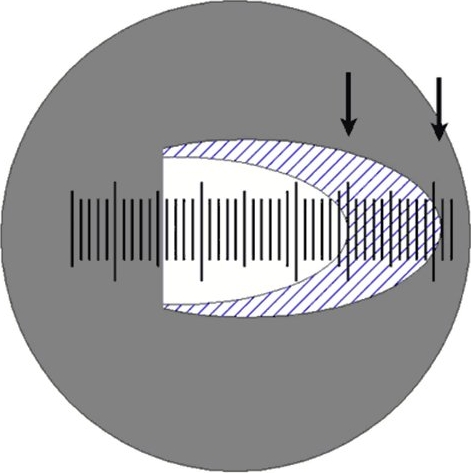 Counting the number of graduations of the microscope reticle within this zone (11 of the smallest hash-marks in the cross-hatched area of the example below), the correct observed thickness for the 1×, 2×, or 4× position of the grinder will be the count divided by 1, 2, or 4 respectively; or, in the example shown below, 11 / 1 = 11 mils, 11 / 2 = 5.5 mils, or 11 / 4 = 2.75 mils. Reading the Microgroover incision |