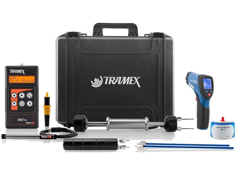 The Tramex BSIK5.1 Building Survey Inspection Kit features the multifunctional Tramex MRH III digital moisture meter allowing for non-invasive testing of moisture conditions in numerous building materials such as drywall, wood, plaster, brick, ceramic tiles, resilient flooring, laminates and roofing.
