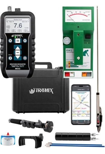 The Tramex MEX5 Moisture Encounter and Humidity Meter is a digital Dual-Depth, non-destructive moisture meter for wood and various building materials such as drywall, roofing, plaster, tile and masonry. The Tramex MEX5 Moisture Encounter and Humidity Meter has a built-in hygrometer for ambient conditions and psychrometric values, an Infrared Surface Thermometer and also incorporates external in-situ RH probes for in-situ equilibrium RH readings, as well as Pin probes for wood, drywall, and WME readings. Moisture test results can be visualized and Geotagged with the Tramex Meters App and turned into moisture maps, reports and charts for sharing.