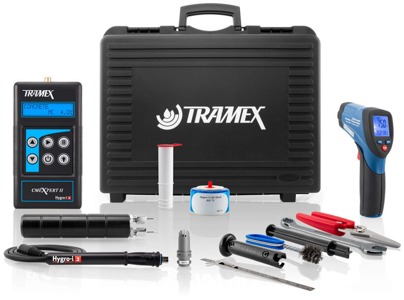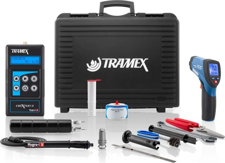 The Tramex FIK5.1 Flooring Inspection Kit is used for moisture testing of concrete and wood flooring to ASTM and other international standards. The Tramex FIK5.1 features the Tramex CMEX II digital concrete moisture meter for testing per ASTM F2659 and 3 best in class reusable Hygro-i2 ® relative humidity probes for testing relative humidity, temperature and dew point in the environment, or performing ASTM F2170 (or Hood Method with optional Hood) for relative humidity readings in concrete slabs. An infrared surface thermometer is included for testing surface temperatures and can be used in conjunction with the Hygro-i2 ® probe to monitor dew point conditions. A heavy-duty hammer pin-probe allows the user to measure the moisture content in wood. Calibration check salts are included in the Flooring Inspection Kit, which comes in a protective heavy-duty carrying case with die-cut foam lining.