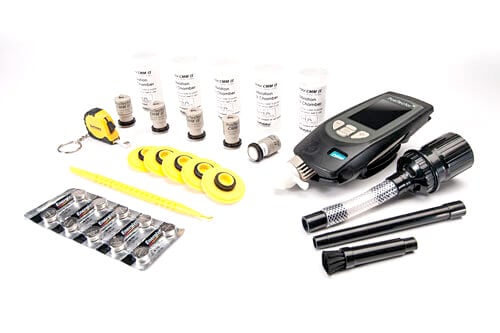 • DeFelsko CMMISKITP3-E PosiTector CMM IS In Situ Concrete Moisture RH Meter, Pro Kit: PosiTector DPM3 Advanced, 5 CMM IS probes, 5 Saturated Salt Solutions, 5 Calibration Check Chambers, 5 Caps, Extraction Tool, Tape Measure, Vacuum Tool Attachments, Ten A-76/LR-44 coin cell batteries, Hard shell carrying case