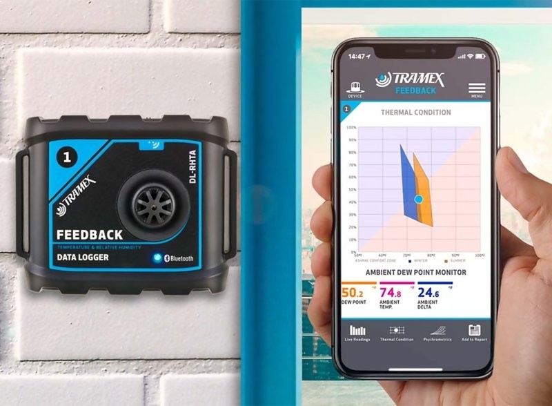 The Tramex Feedback DataLogger and App have been designed and developed by Tramex for professionals who depend on accurate, reliable readings using the very best, state of the art technology. The Feedback DataLogger and App log up to 100,000 data point entries for relative humidity, temperature, dew point and grains per pound, transmitted wirelessly via Bluetooth BLE technology to your mobile device. On the App you can visualise Live Readings, Thermal Conditions and Psychrometric Charts as well as creating and exporting spreadsheets, charts and reports. The Tramex Feedback DataLogger requires the Tramex Feedback Data Logger App and a compatible iOS or Android mobile device.