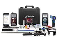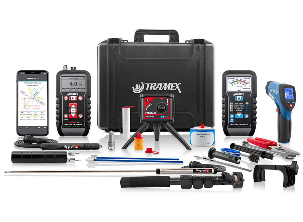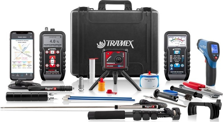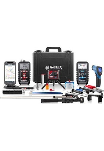 The Tramex WDMK Water Damage Restoration Master Kit is ideal for moisture and relative humidity testing and monitoring of buildings and building materials. Featuring the Tramex ME5 Moisture Encounter Non-Destructive Moisture Meter for dual-depth, non-invasive testing of moisture conditions in drywall, wood, plaster, brick, tiles, resilient flooring, laminates and roofing. The Tramex CMEX5 Concrete Moisture Encounter X5 for non-destructive quantitative and comparative testing of concrete and ambient conditions. The CMEX5 incorporates a plug-in heavy-duty pin-probe measures Moisture Content in wood or WME in other building materials. The CMEX5 also incorporates plug-in RH probes for in-situ testing of concrete, building materials, structures and air spaces. These probes can be used with the Feedback Datalogger to give live readings and time logs of relative humidity, temperature and dew point in the environment and in materials and air spaces. An infrared surface thermometer gives surface temperature and dew point conditions used in conjunction with the CMEX5 hygrometer. The Water Damage Restoration Master Kit comes with an extension handle in a protective heavy-duty carrying case with die-cut foam lining. The Tramex Meters App allows you to GeoTag test results, create, save and share reports and charts, as well as see your meter screen on your phone when extending to hard to reach places.