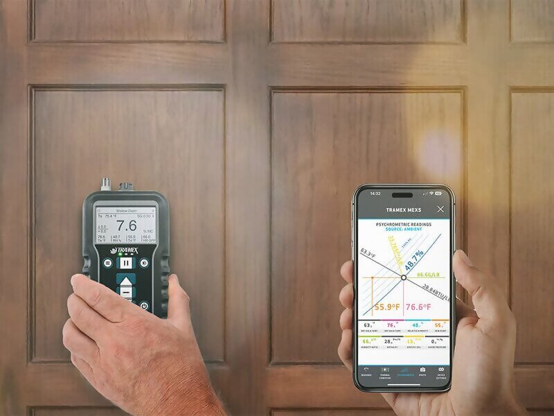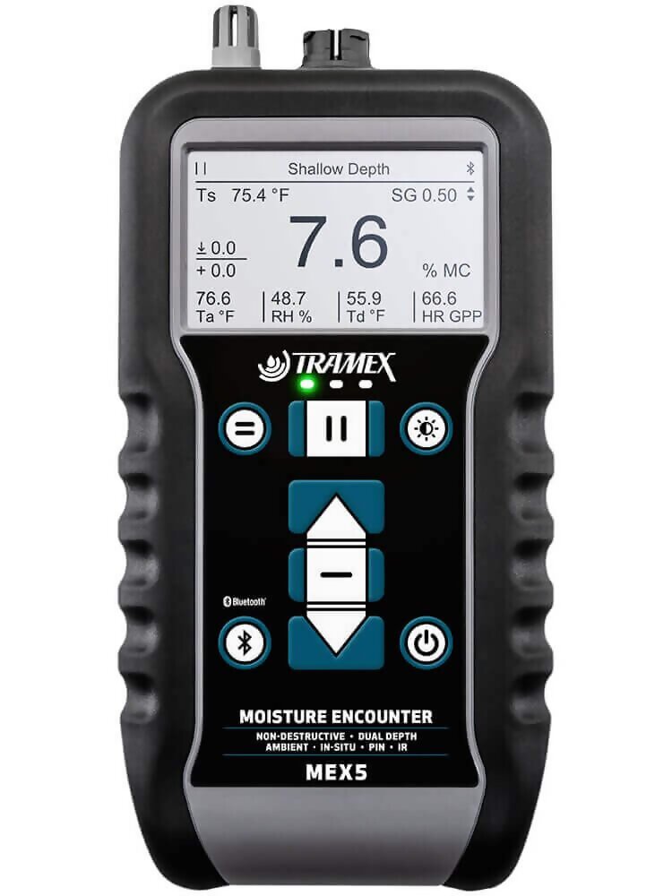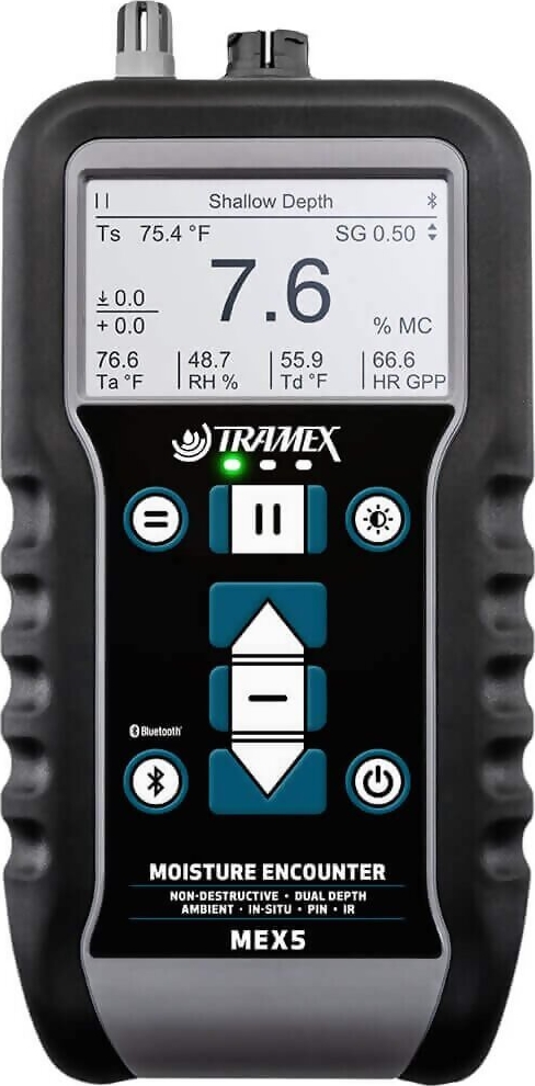 The Tramex MEX5 Moisture Encounter and Humidity Meter is a digital Dual-Depth, non-destructive moisture meter for wood and various building materials such as drywall, roofing, plaster, tile and masonry. The Tramex MEX5 Moisture Encounter and Humidity Meter has a built-in hygrometer for ambient conditions and psychrometric values, an Infrared Surface Thermometer and also incorporates external in-situ RH probes for in-situ equilibrium RH readings, as well as Pin probes for wood, drywall, and WME readings. Moisture test results can be visualized and Geotagged with the Tramex Meters App and turned into moisture maps, reports and charts for sharing.