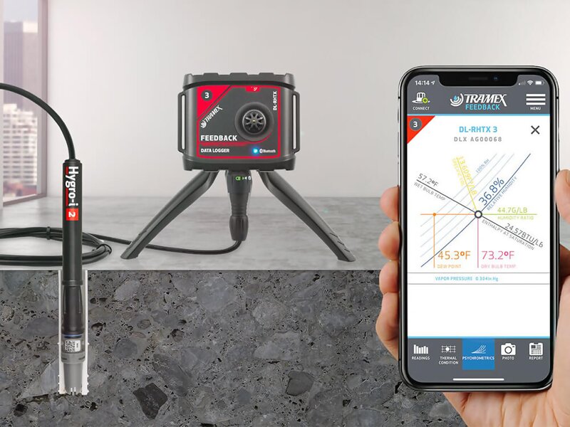 The Tramex DL-RHTX Feedback DataLogger and App log up to 100,000 data point entries for relative humidity, temperature, dew point and grains per pound, transmitted wirelessly via Bluetooth BLE technology to your mobile device. Used to perfom ASTM F2170 with the Tramex Hygro-2 probe.