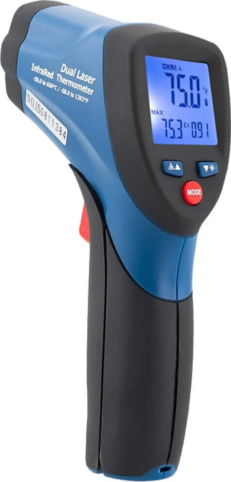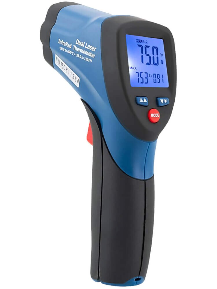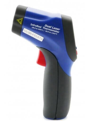 The Tramex IRT2 Infrared Surface Thermometer is a handheld, dual laser, non-contact Infrared Thermometer with 12:1 distance to spot ratio and audible and visible high/low set point alarms. It is used to measure and display surface temperatures within the range of -58ºF to 1202º (-50°C to 650°C) and has an accuracy of approximately 1 to 1.5% (see Specifications for details). The Tramex IRT2 Infrared Surface Thermometer has a fast response time (0.15 sec) and is powered with a 9V battery and complies with Class II UK/EU laser safety standard EN60285.