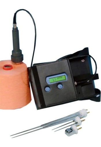 The new DHT-2 Textile Moisture Meter instantaneously measures the humidity percentage in fibers, yarns and bales of raw, synthetic or mixed textile material. 17 stored measurement scales for the following materials: wool ,rayon, cotton, linen, nylon, acrylic, polyester, 50% wool-50%cotton, 60% cotton-40% PES, 70%pac-30% wool, 67%pac-33% cotton, 70%PES-30% wool, 70%pes-30%rayon, 67% PES-33% cotton, 50% PES-50% cotton, 50%PES- 50% rayon, 50%pes-50%pac The DHT-2 Moisture Meter is supplied with probe holder, connection cable in carrying case, needle probes 414 & 418  Measuring principle: The moisture content is determined by measuring the electrical conductivity of the material, which always is proportional to the content of the moisture. Click Here for Conversion Tables