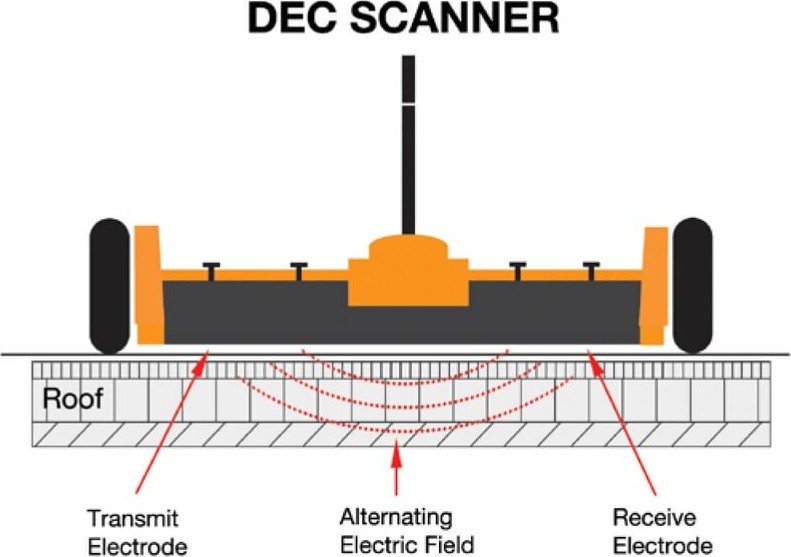 The Dec Scanner detects and evaluates the moisture conditions within roofing systems by non-destructively measuring the electrical impedance. A low frequency electronic signal is generated, transmitted into the material under test via one of the two electrodes incorporated in the rubber electrode mat, and received by the second electrode. The strength of this signal varies in proportion to the amount of moisture in the material under test. The Dec Scanner determines the strength of the current and converts this to a comparative moisture content value. By moving the Dec Scanner across a roof surface in a regular pattern, a continuous reading is obtained, and areas that contain moisture can be readily identified