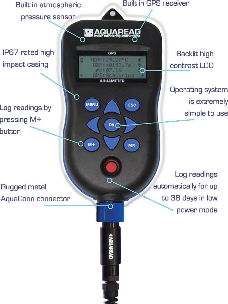 Even if you will be using your Aquaprobe with an AquaLogger or other device, you will still need a GPS Aquameter. The meter gives you real-time readings via the display, which are useful when deploying your logging system, as it allows you to check that the parameters are all reading ok.