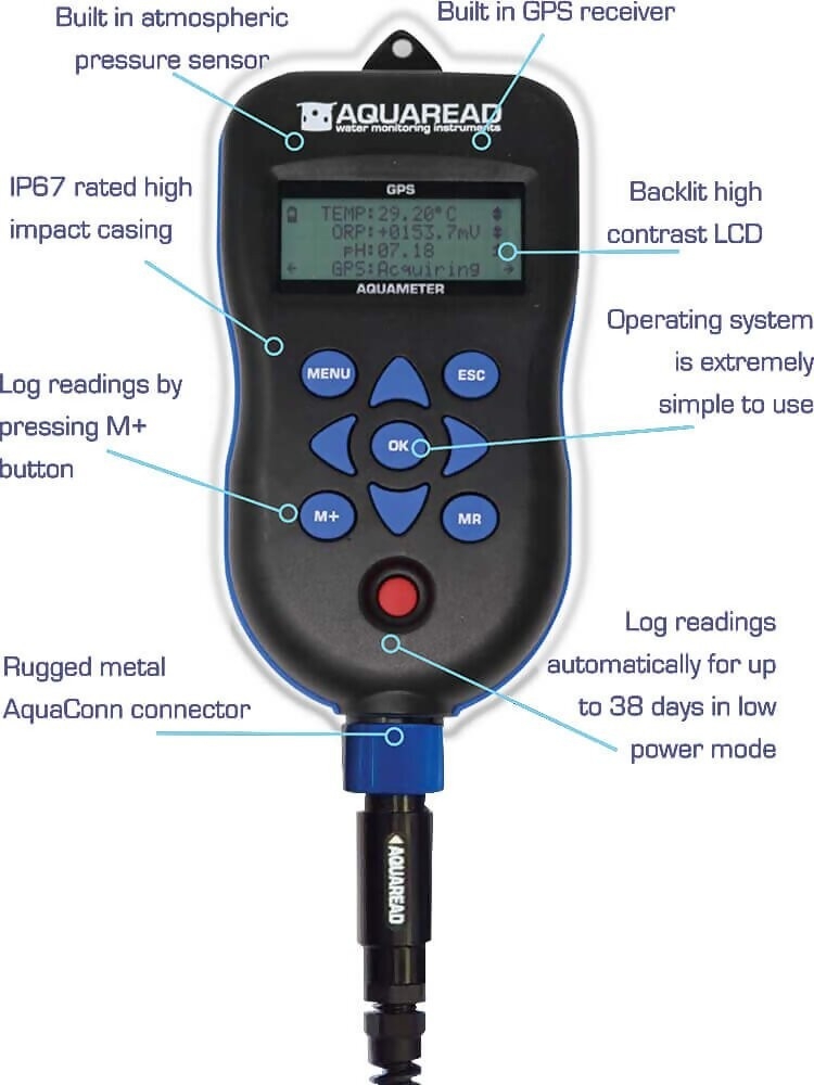 Even if you will be using your Aquaprobe with an AquaLogger or other device, you will still need a GPS Aquameter. The meter gives you real-time readings via the display, which are useful when deploying your logging system, as it allows you to check that the parameters are all reading ok.