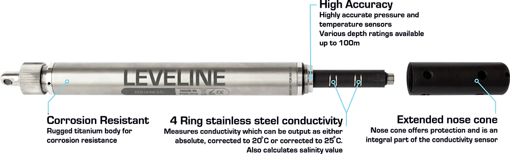 The LeveLine CTD Absolute uses a piezoresistive ceramic pressure sensor to provide excellent durability and long-term stability whilst delivering an impressive accuracy of 0.05% FS. A variety of level ranges are available and all of them are temperature compensated across a scale of -20 to 80 deg. C. The conductivity sensor is adapted from our long established Aquaprobe range and records measurements of conductivity and salinity with an impressive 0-200,000 us/cm range or 0-70 PSU for Salinity.