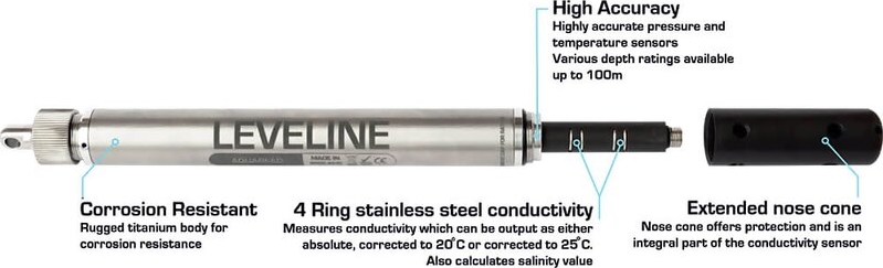 The LeveLine CTD Absolute uses a piezoresistive ceramic pressure sensor to provide excellent durability and long-term stability whilst delivering an impressive accuracy of 0.05% FS. A variety of level ranges are available and all of them are temperature compensated across a scale of -20 to 80 deg. C. The conductivity sensor is adapted from our long established Aquaprobe range and records measurements of conductivity and salinity with an impressive 0-200,000 us/cm range or 0-70 PSU for Salinity.