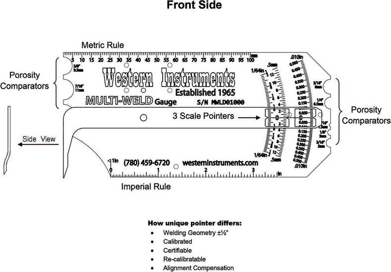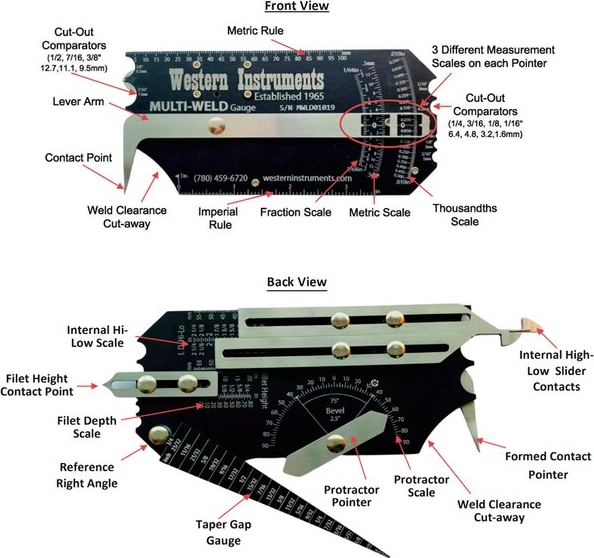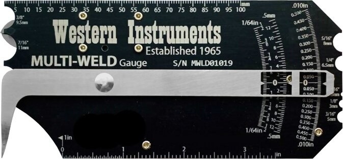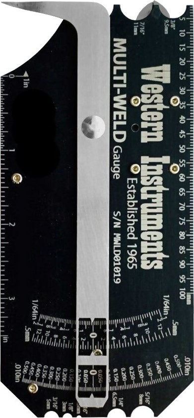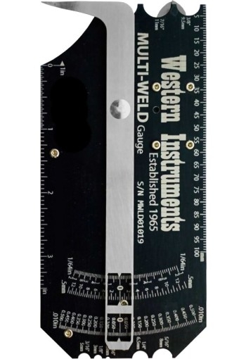 The Western Instruments N88L-3 Multi-Weld Gauge provides an easy way to read measurements of the following welding and fit-up parameters: Internal Hi-Lo, Gap, Filet Height and Leg Length, Weld Height, Undercut Depth, Misalignment, and Angle of Preparation. The Multi-Weld Gauge is equipped with 3 separate scales for all measurements. Metric and Imperial (Thousands of an inch and fractions of an inch). Rules for liner measurements are located on the top and bottom of the Front side of the Scale Plate. The Multi-Weld Gauge is also equipped with 7 unique diameter comparators which are half circles in 1/16" to 1/2" in 1/16" increments (1.6mm to 12.7mm in 1.6mm increments) for convenient diameter estimates (Filet Welds, Welding Rod/Wire, etc.)