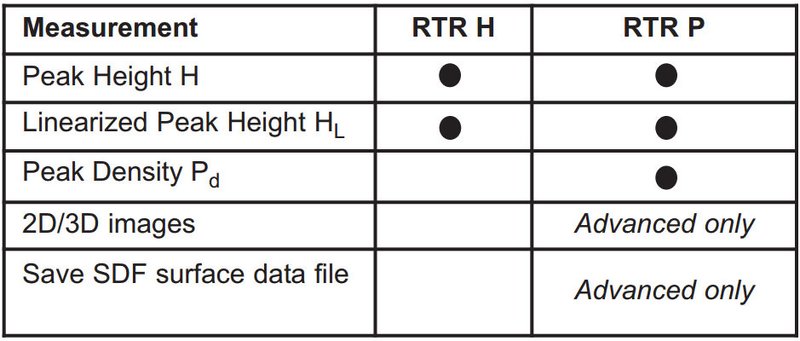 PosiTector RTR-P models also measure peak density (Pd). Advanced RTR-P models generate 2D/3D images and SDF Surface Data Files.