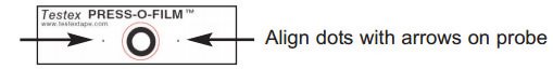 Measure Insert the burnished replica tape into the measurement opening. Ensure the tape is properly positioned so that the burnished region is centered within the opening in the probe with the adhesive (sticky) side down. To position the tape, move the tape to the back of the probe and align the two dots (printed on replica tape) with arrows on both sides of the measurement opening. |