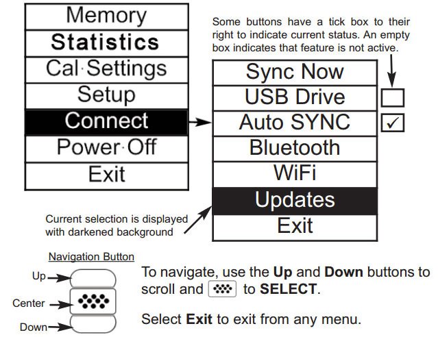 - Power-up the Gage by pressing the center navigation