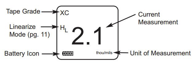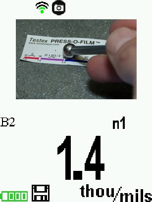 Once positioned, firmly press both probe buttons simultaneously and hold until the Gage beeps and the measurement is displayed. During measurement, a constant anvil pressure is applied to the replica tape regardless of how hard the two buttons are pressed. The Gage automatically subtracts the 50.8 ?m (2 mil) of incompressible polyester film. No further adjustments are required.