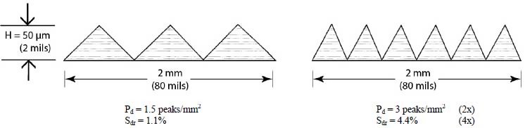 The figure below is a simplified example of why BOTH peak height AND peak density are important to the understanding of coating performance. The two surfaces have different geometries yet their height measurements are the same. Peak density measurements give a clearer picture of the surface available for bonding.