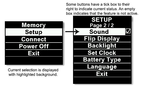 Gage functions are menu controlled. To access the Menu, power-up the gage, then press the center navigation button. Below is a sample menu for a PosiTector Advanced Model: