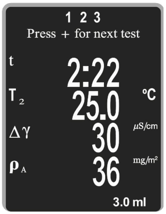- Wait until the measurement stabilizes (up to 5 seconds), then press the (+) button to save a new background conductivity measurement ( ?1) and the water temperature (T1).