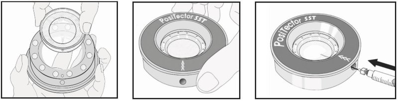 - Turn the PosiPatch and magnetic ring upside down. Place the PosiPatch into the magnetic ring ensuring the arrows align with the injection port. Do not touch the PosiPatch’s interior.