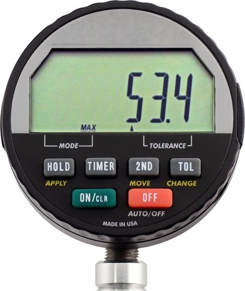 The Rex RX-DD-5 digital durometer is the latest innovation for performing timed hardness testing. The Rex RX-DD-5 is equipped with an adjustable timer and onscreen countdown that can be set to delay from 0-30 seconds. When enabled, the timer function will be automatically activated when the presser foot meets the test specimen. Up to 200 readings can be stored and viewed inside the durometer or downloaded through the USB port.