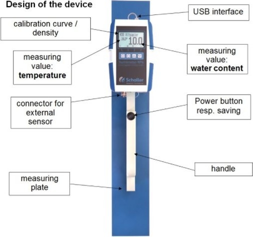 Turn on your RP6 moisture meter by pushing the black button on the handle of the device. Choose your calibration (e.g. 350 recycling paper) and press the measuring plate against the paper bale. The display immediately shows the water content and temperature. The measuring values can be stored in the humimeter RP6 memory, additional information like supplier’s data and notes can be added. The stored values can be sent to a PC if required. Measurements can be printed immediatley via the optionally available portable printer. For measurement of other relevant process parameters, a humidity and temperature sensor can be connected
