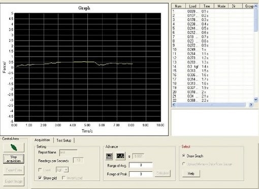 Allows full testing of FG-7000 Series Force Gauges with live analysis of the test results. Users can set a delay or a time period for the test data to record as well as begin or end if a load threshold is reached. The load can be inverted so the graph shows the resultant force in the direction desired. Average and peak readings are automatically calculated, but the user can zoom in on a section of a graph and recalculate the new average and peak over the selected portion of the test.
