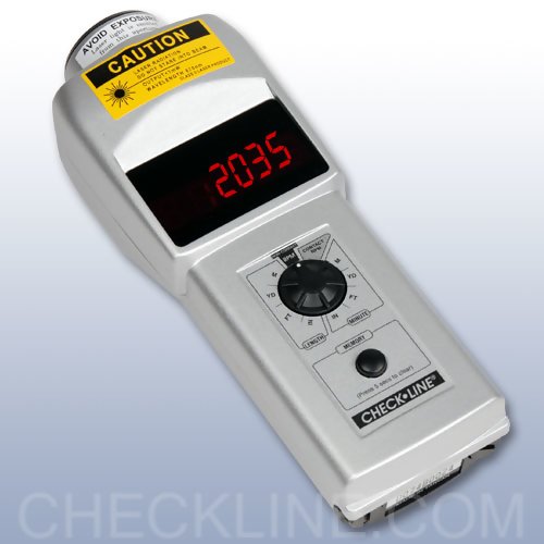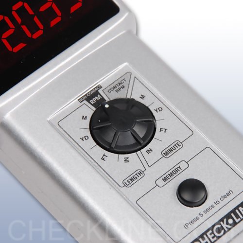 | 4 Models: DT-205LR LCD Display with 6" Circum Measuring Wheel DT-205LR-12 LCD Display with 12" Circum Measuring Wheel DT-207LR LED Display with 6" Circum Measuring Wheel DT-207LR-12 LED Display with 12" Circum Measuring Wheel NSN: 6680-01-378-6490 NOTE: DT-205L & DT-207L models have been replaced by the new "LR" models featuring smaller & brighter "Laser dot" The CHECK-LINE DT-205LR & DT-207LR handheld tachometer combine the best features found in both contact and non-contact tachometers for the accurate measurement of rpm, surface speed and length. The screw-in contact adapter makes it quick & easy to convert from non-contact to contact operation.