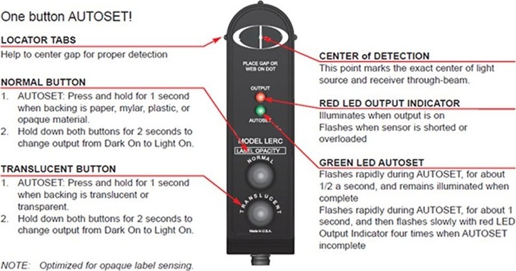 The Checkline LS-GAPSENSOR is a photoelectric sensor designed to sense the "gap" between labels and provide a trigger signal used to flash a stroboscope. Since the LS-GAPSENSOR is an automatic one-touch sensor…not the conventional "teach mode" sensor…set-up is simple. Position the gap between the labels directly under the sensors sight guide and push the appropriate Autoset™ button. The sensor does the rest, adjusting itself to the perfect setting. Sensing labels has never been easier