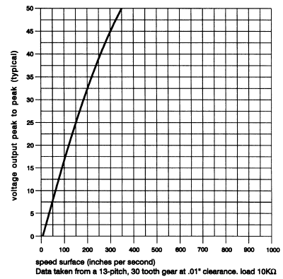 The Shimpo MP-10 Magnetic Pick-Up Sensor a sine wave output whenever there is an abrupt change from non-magnetic to magnetic material moving past the sensor pole. The output volate is directly proportional to the change in magnetic flux intensity over the change in time.