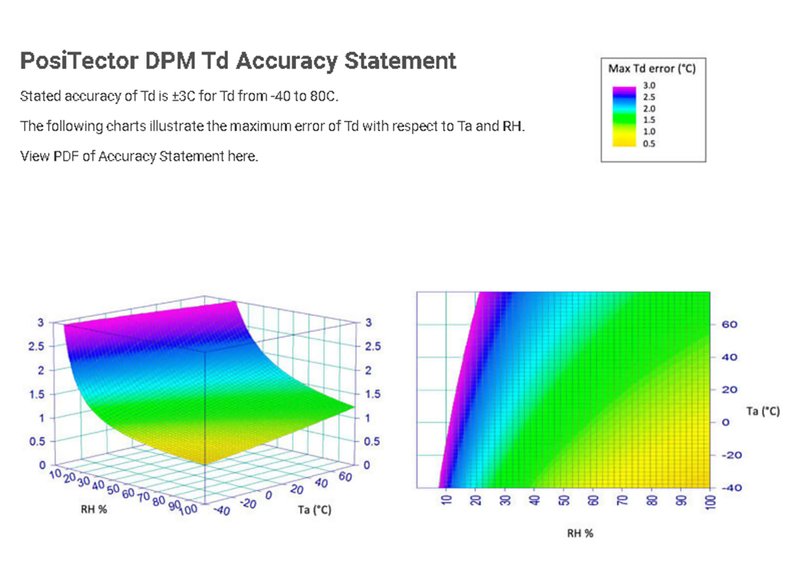 The PosiTector DPM L provides accurate dew point readings (±3° C) down to -40° C.Dew point is a calculated value, based on temperature and humidity. At low negative dew point temperatures, the calculation is highly dependent on relative humidity and changes of ±3% RH (the tolerance of the PosiTector DPM’s humidity sensor) can have a significant impact on the dew point temperature.The Dew Point (Td) Accuracy page details the accuracy of the calculated dew point temperature based on the measured temperature and humidity.