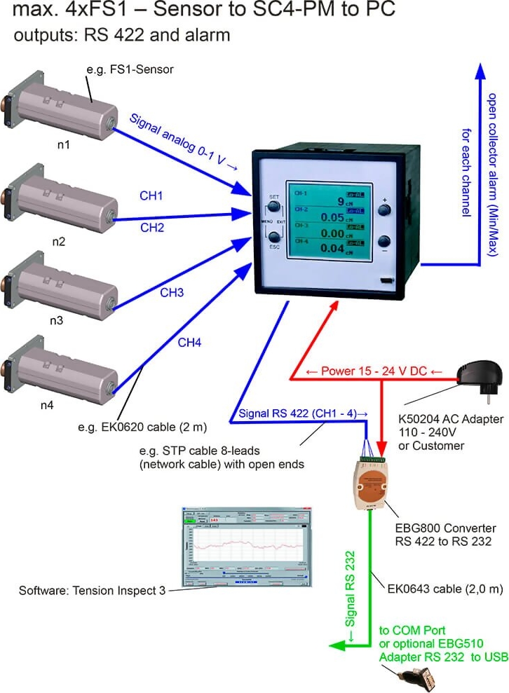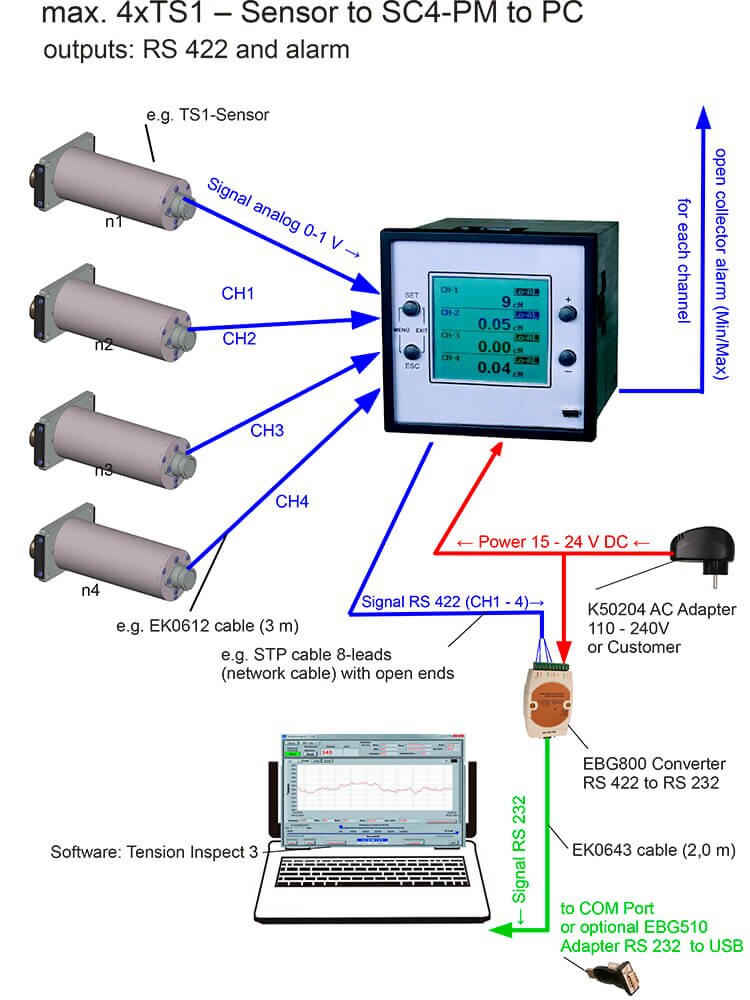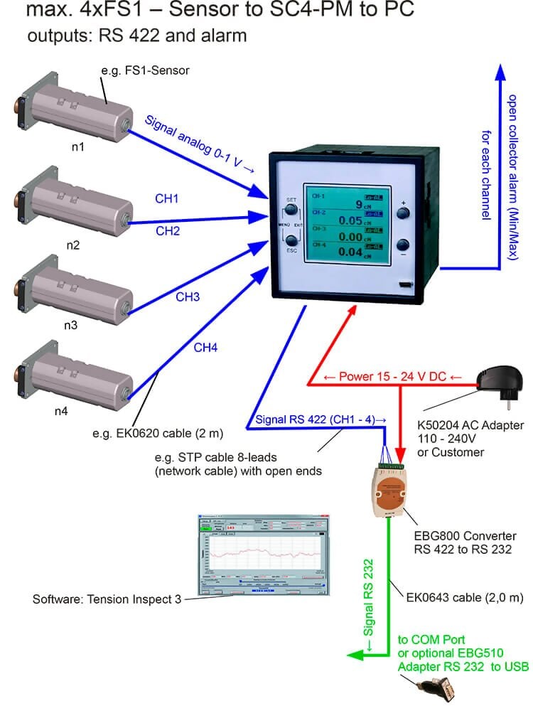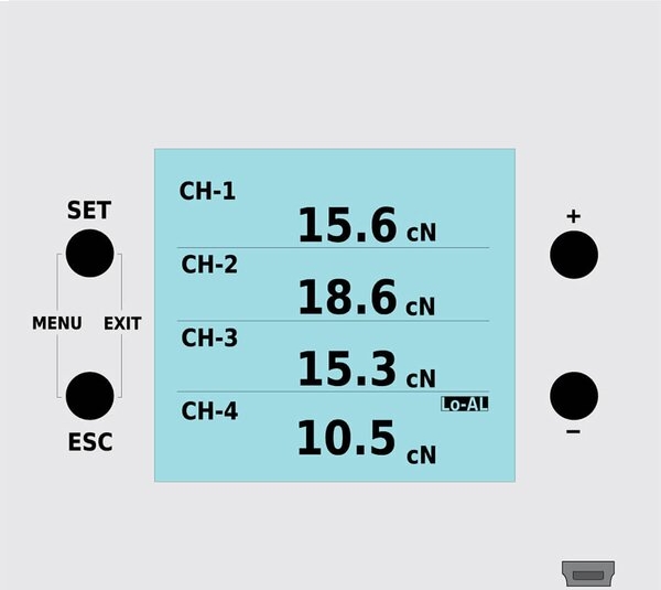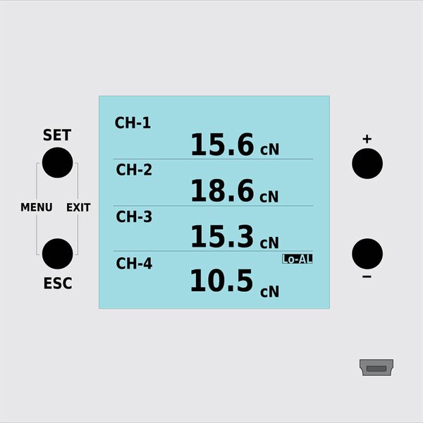 The Hans-Schmidt SC4-PM Digital Tension Indicator is designed to connect to up to four (4) separate tension sensors. The current value of each of the connected sensors are shown simultaneously as a numeric value along with the engineering units