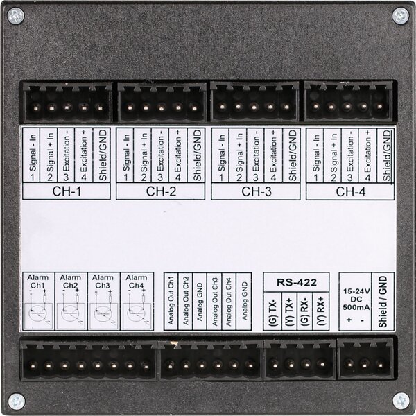 Suitable for connecting a maximum of 4 sensors (different ranges are possible) with analog output 0 – 1 V DC or optional series without integrated amplifier (output mV/V)