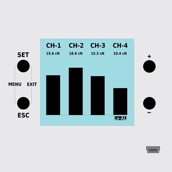 - Easy operation using keys: menu for configurating the device (alarm limits, damping, units, tension range, language, material curve)