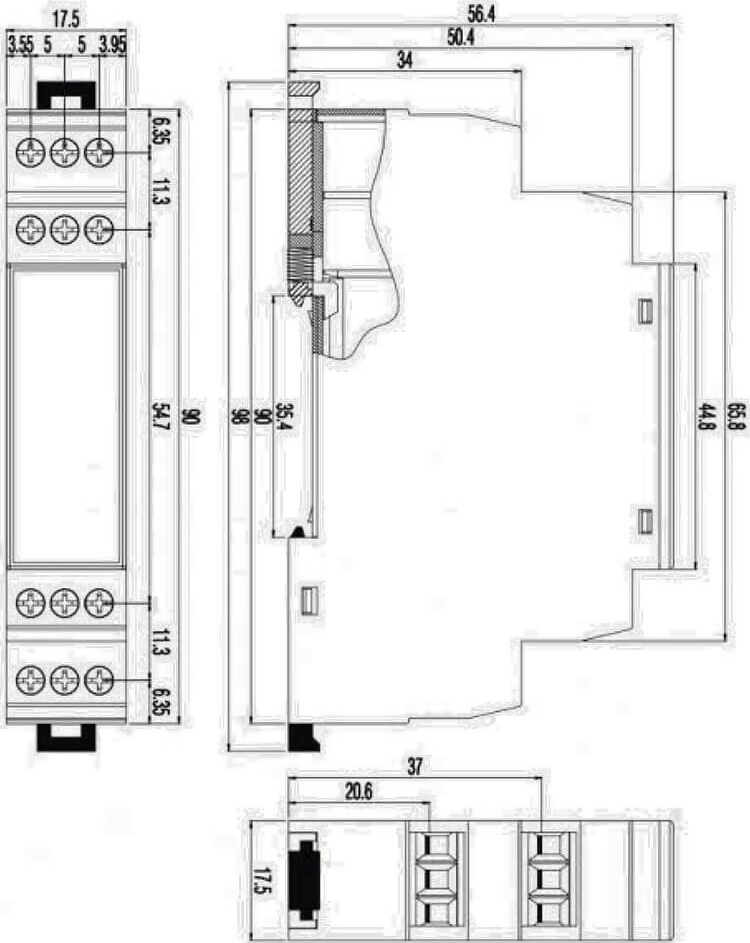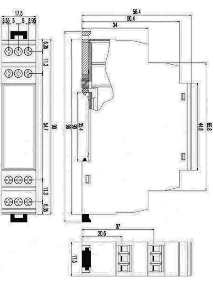 | Dimensions | 90 x 56 x 18 mm (LxWxH), DIN EN 60715 tophat rail box |