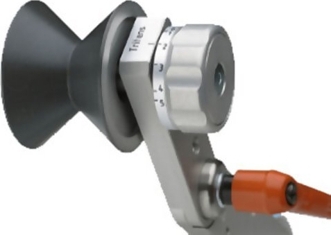 It consists of an calibrated rotary dial fitted to the rear-side of the right outer roller. The user simply rotates the dial until the numeric value on the dial is set to the actual wire diameter & then is locked in position. To change for a larger or smaller diameter, unlock and dial to new value. Simple, quick and effective!
